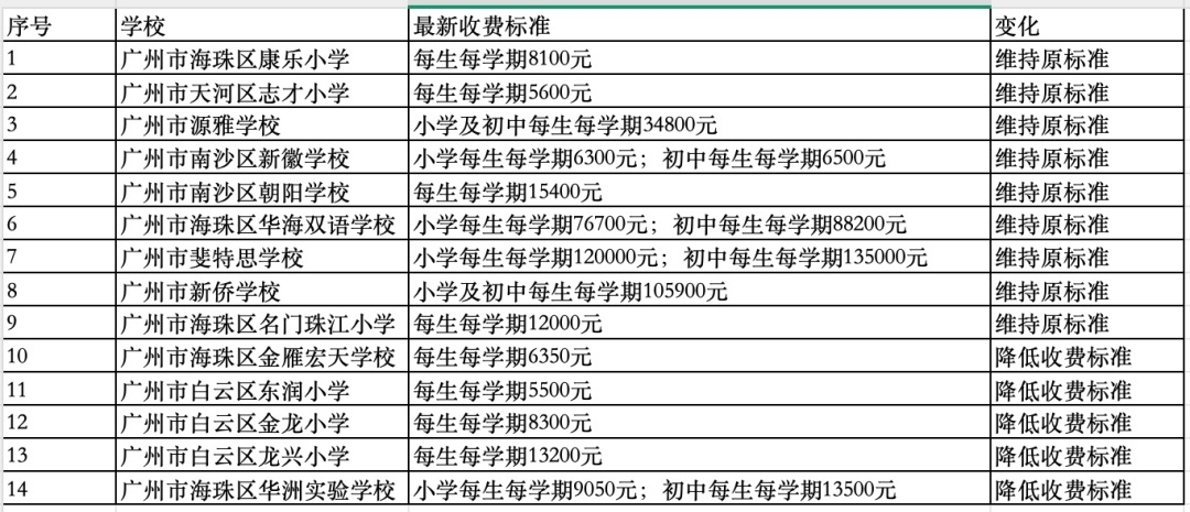 其中,对广州市海珠区华洲实验学校、广州市白云区龙兴小学、广州市白云区金龙小学、广州市白云区东润小学、广州市海珠区金雁宏天学校等5所学校予以降低收费标准。