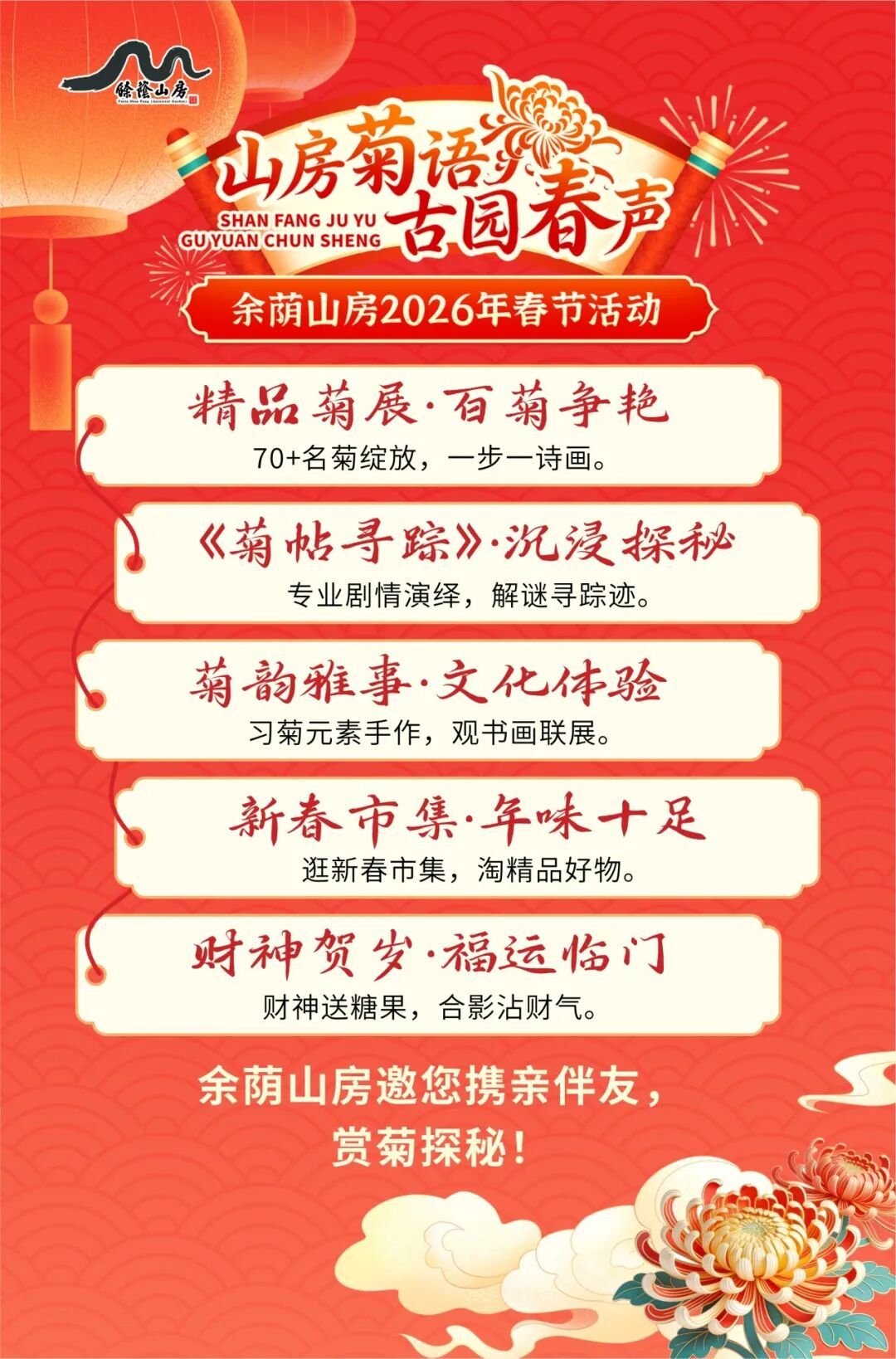 今年余荫山房依旧延续多年春节赏菊的传统特色,汇聚各类精品菊,包括枫叶吟秋、淡妆垂露、泉乡法力、泉乡冲天、火凤凰、三色球菊、多彩乒乓菊等近70多个难得一见的品种。