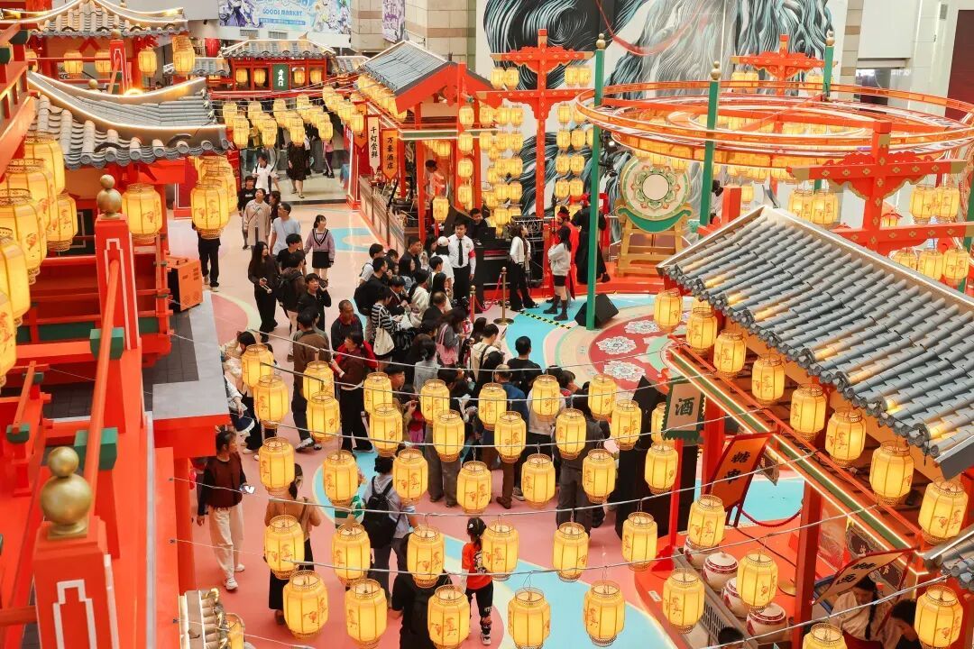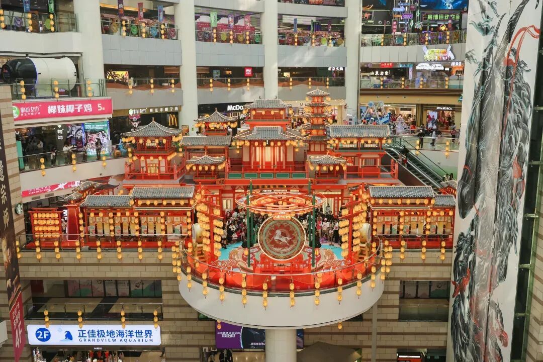 户外北广场打造长达三十米的“山海奇骏”灯组结合音乐喷泉水舞秀;广场内部,一盏高达十米、置身浪漫桃林的“云腾逐梦”天马灯巍然矗立于一楼中庭;四楼中庭《盛世唐城》则以唐代大明宫为蓝本复刻出殿宇廊桥的皇家园林景象,花灯点缀其间,构建出一个完整可步入的盛唐时空。