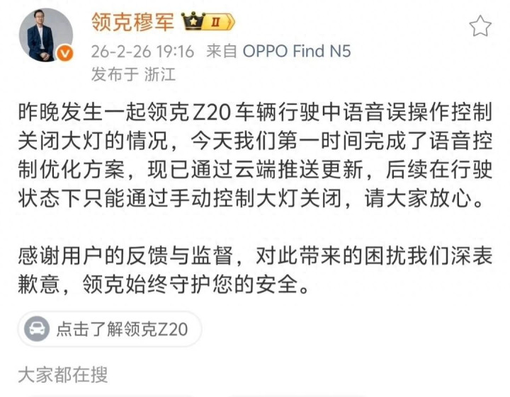 事件曝光后,领克官方确认属语音误操作,并已通过OTA推送限制:行驶中大灯仅允许手动关闭。