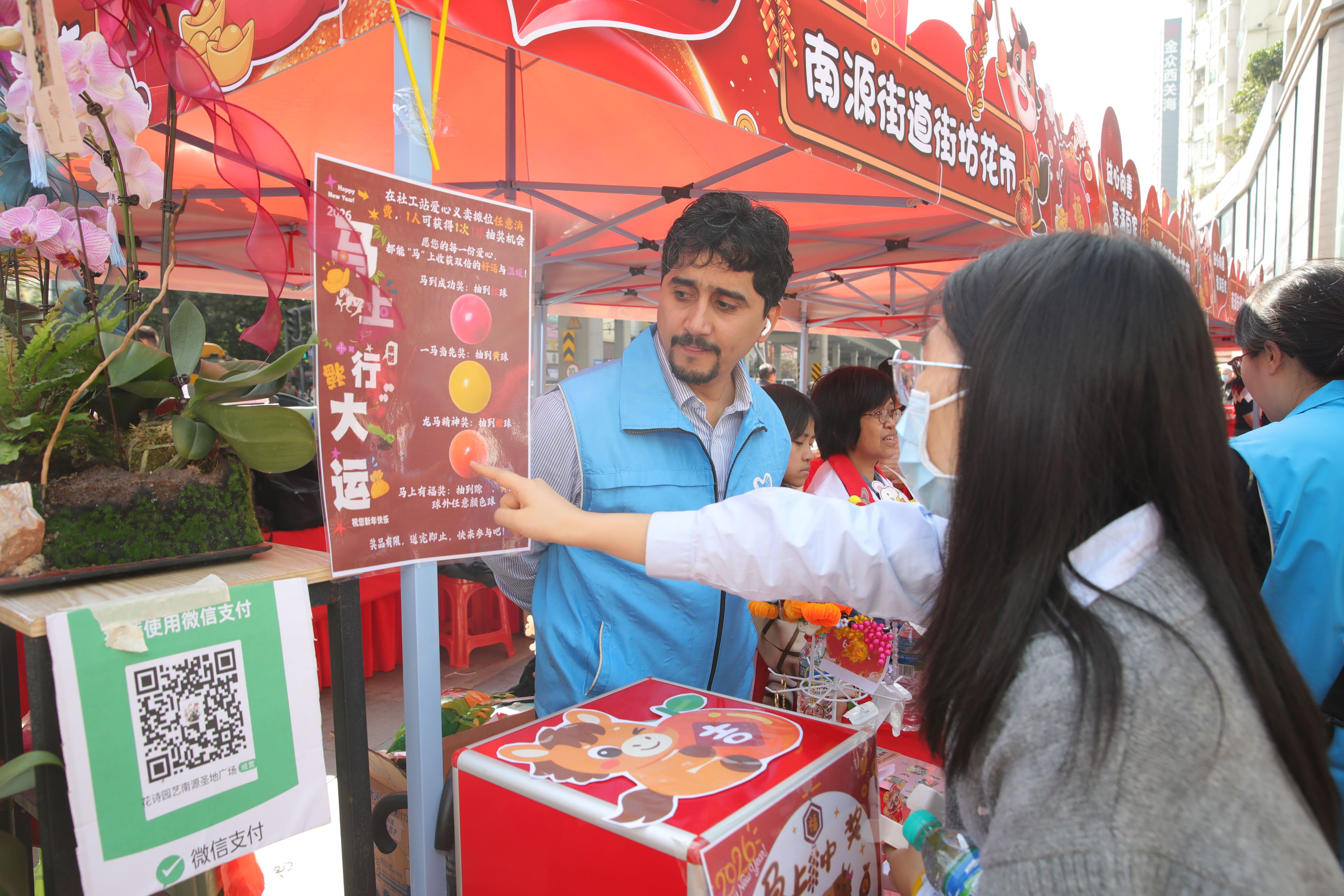 在这次南源街道“益心向善·爱满百家”首届街坊花市中,他主动报名参与志愿服务。用他自己的话来说,是又可以开开心心逛花街,体验一把当“老广”的感觉,还可以为社区贡献一份外国人的志愿力量。
