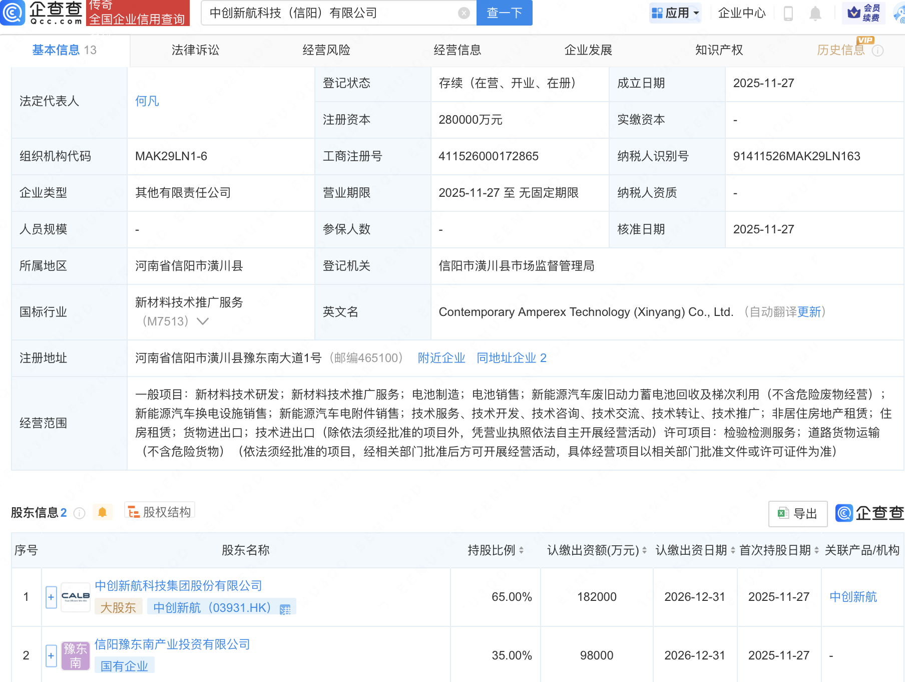 近日,中创新航科技(信阳)有限公司成立,注册资本28亿元,经营范围包含:新材料技术研发;新材料技术推广服务;电池制造;电池销售等。企查查股权穿透显示,该公司由中创新航(03931.HK)等共同持股。